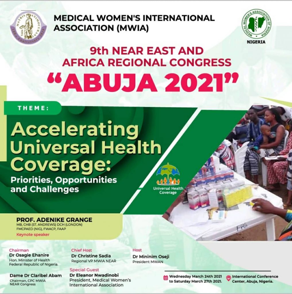 The National President, Medical Women’s Association of Nigeria (MWAN), Dr. Mrs Mininim Oseji has said that the group will host 9th Congress of the Medical Women’s International Association Near East and Africa Region billed to take place in FCT, Abuja, Nigeria between 25th to 26th March, 2021 as part of efforts to deepen stakeholders commitment to Universal Health Coverage towards sustainable healthcare services in Nigeria, Africa and globally.