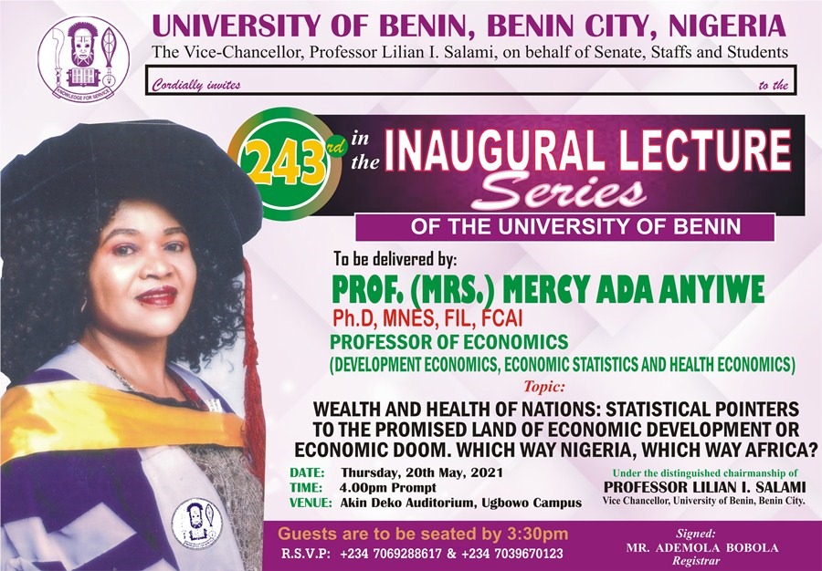 243RD Inaugural Lecture:UNIBEN VC Tips Delta Born, Institution’s Professor of Development, Statistics And Health Economics, Professor (Mrs) Mercy Ada Anyiwe To Address, Profer Solutions To Nigeria, Africa’s Economic Challenges.