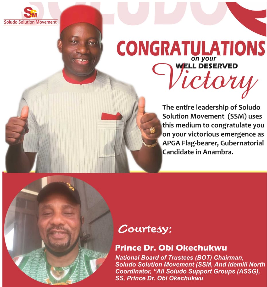 “The Entire Leadership of Soludo Solution Movement, SSM Uses this medium to Congratulate you on your victorious emergence as APGA Flag-bearer, Gubernatorial Candidate In Anambra State for the November 6, 2021 general elections”.