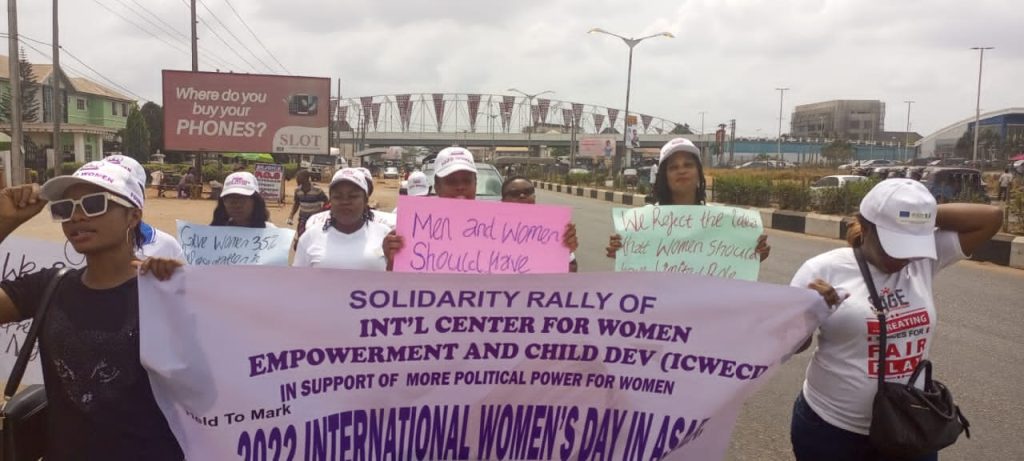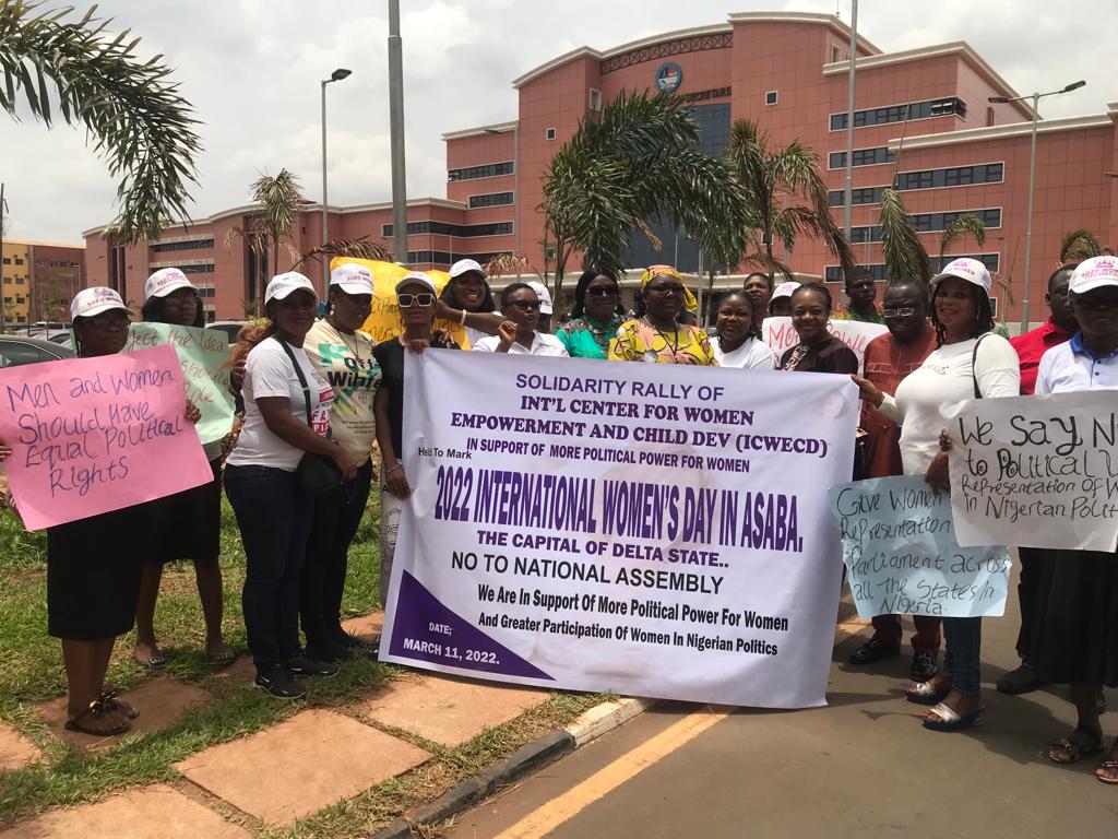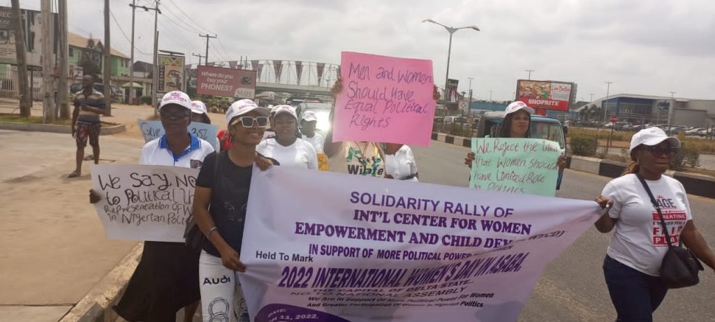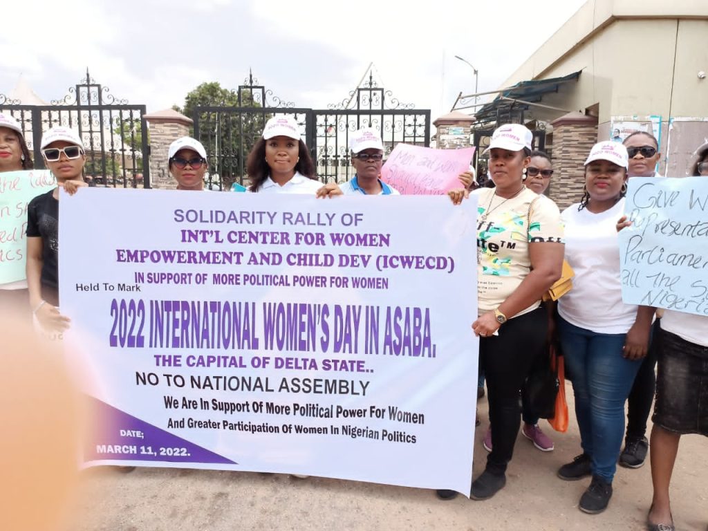 She said: “Int’l Center for Women Empowerment and Child Dev, (ICWECD) is commemorating today in Asaba the capital of Delta State the 2022 International Women’s day with this protest march held to register our opposition and disappointment , over the recent rejection of the bill for the creation of 111 special seats in the national and sub-national parliaments in the country exclusively for Nigerian women”.