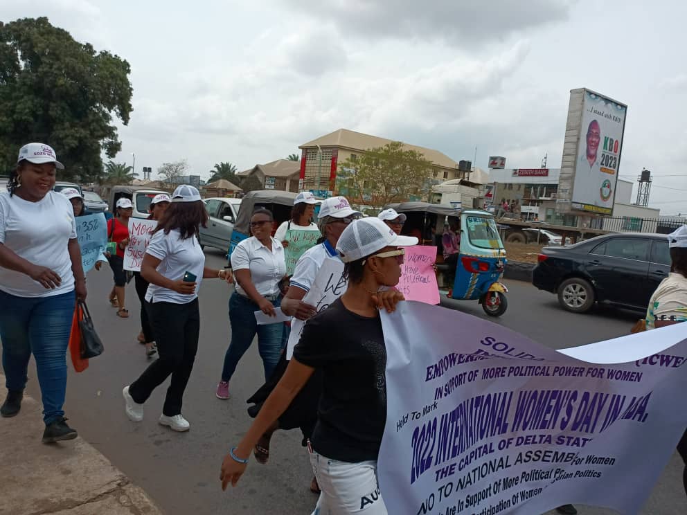 Our reporter yesterday being Friday, 11th March, 2022 in commemoration of International Women’s Day in Asaba, Delta State capital observed the solidary rally, peaceful protest as carried out by the leadership of International Centre For Women Empowerment And Child Development, ICWECD led by Barr. Mercy Abolo in collaboration with Sozo Women Foundation led by Joyce Ogochukwu Nsaka and Women leaders of Civil Society Organizations in Delta State as group said they were fully in support of more political power for Women and greater participation of Women in Nigerian Politics.