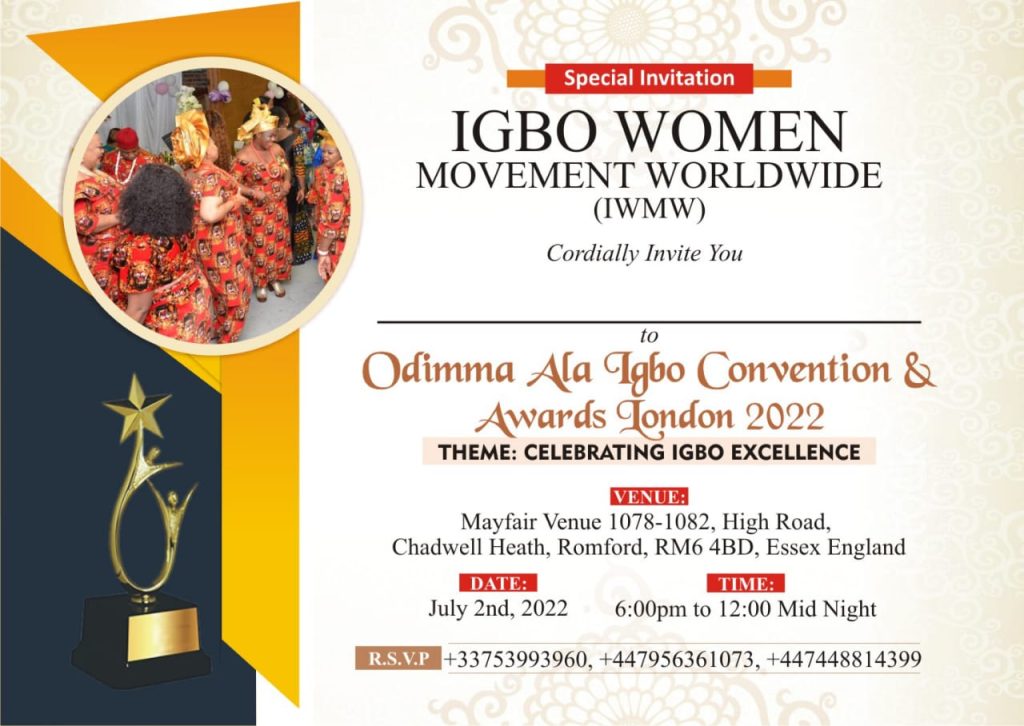 I formally write to congratulate the entire leadership of ADAIGBO GBURUGBURU the CEO and CONVENER OF IGBO WOMEN MOVEMENT WORLDWIDE and her principal Executives and Members on the occasion of her *”Odimma Ala IGBO Convention And Awards London 2022″ and CELEBRATING IGBO EXCELLENCE.