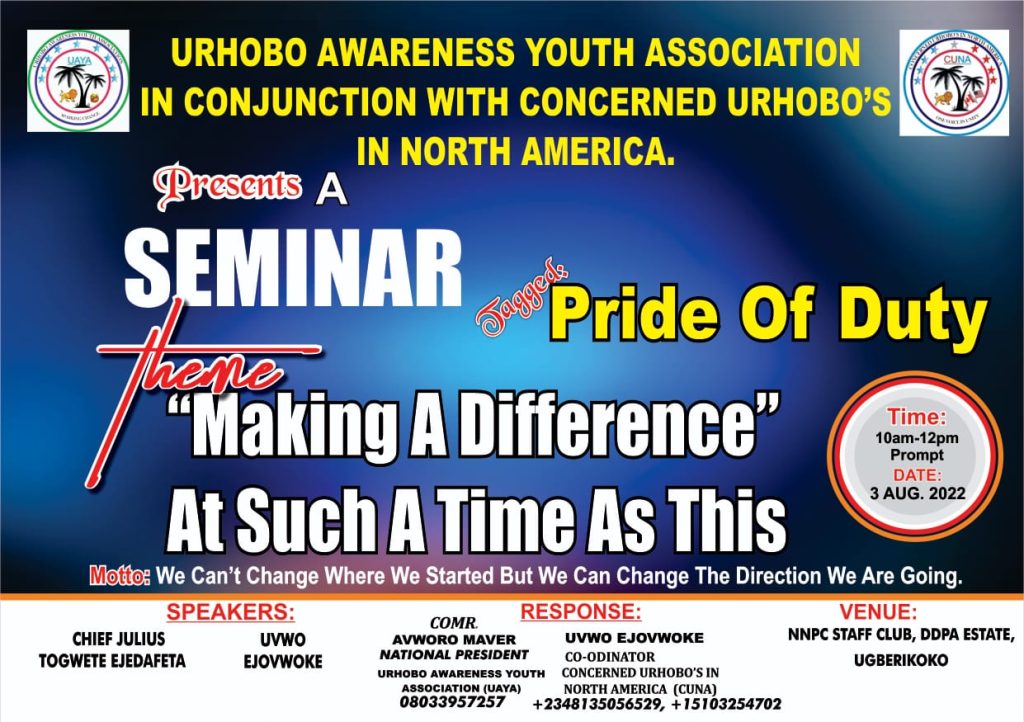 Revealing the content of the awareness creation for the Youths of Urhobo Nation by his group, Urhobo Awareness Youth Association in conjunction with a diaspora group, Concerned Urhobos in North America in a seminar tagged: “Pride of Duty”, with the theme: “Making A Difference At Such A Time As This”, which he said will take place on 3rd of August, 2022 between the hours of 10am to 12pm at the venue: NNPC Staff Club, DDPA Estate, Ugberikoko, Delta State.