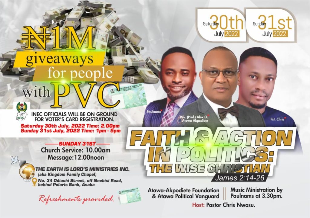 According to the University DON, there will be refreshments and N1M giveaways for people with PVCs as the officials of Independent National Electoral Commission (INEC) will be on ground both days for the Voters Card Registration. The event will take place at a popular Asaba Church with host Pastor Chris Nwosu and Music Minister Paunams performing. The given venue: “The Earth Is The Lord’s Ministries (Aka Kingdom Family Chapel), No. 34, Odiachi Street, Off Nnebisi Road, Behind Polaris Bank, Asaba”.