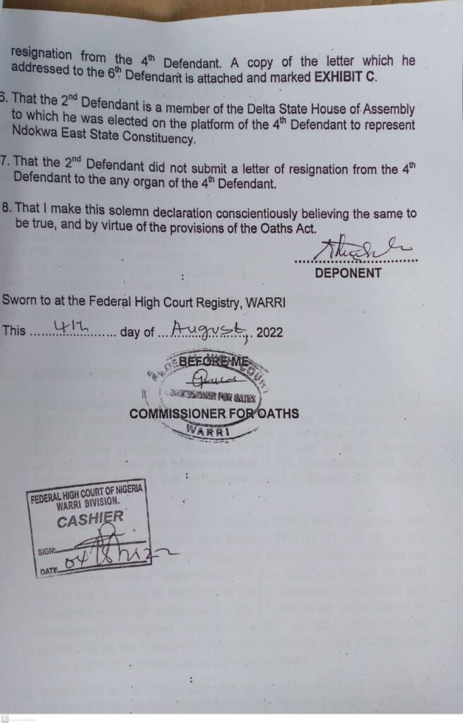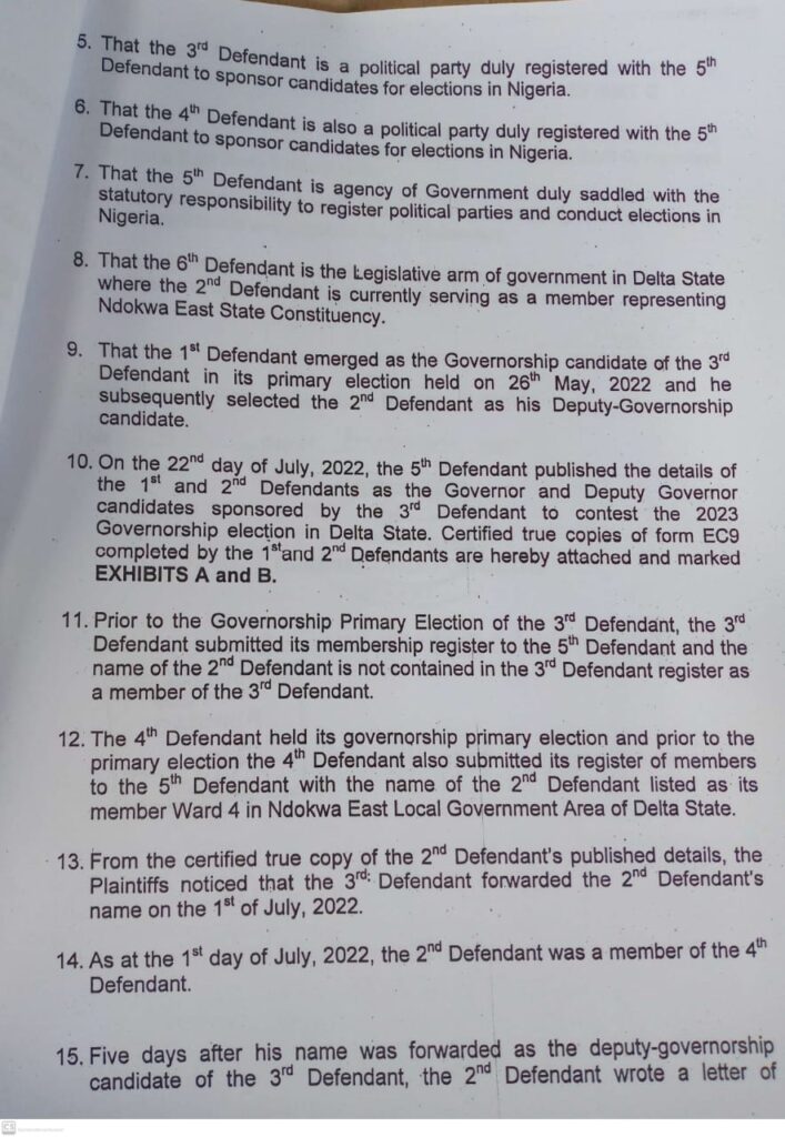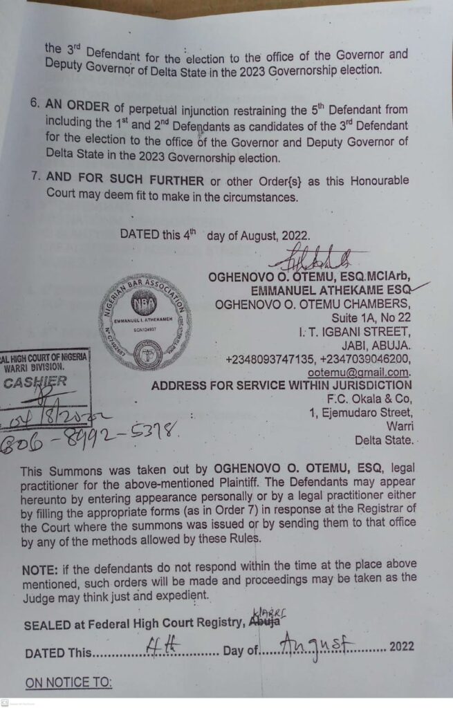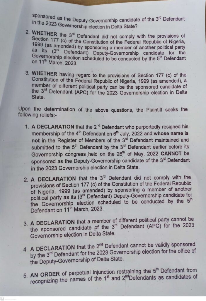 DELTA GUBER 2023: APM GUBER CANDIDATE ASKS COURT TO COMPEL APC, PDP, DTHA, INEC TO PUBLISH THE DATES OF OSANEBI’s NOMINATION AND RESIGNATION.