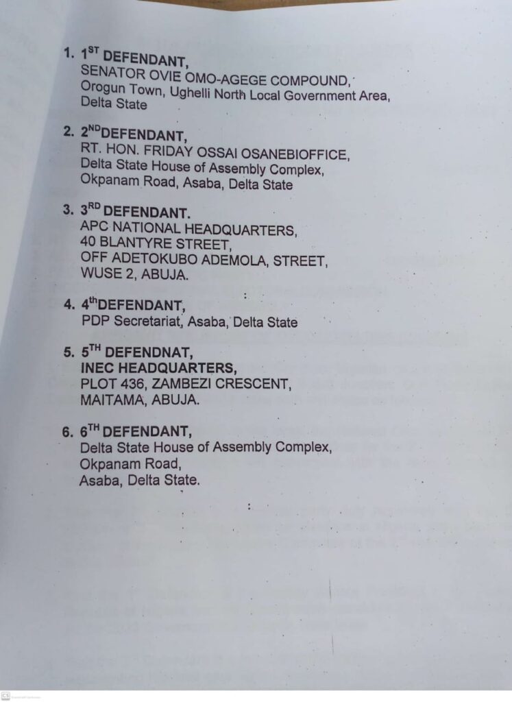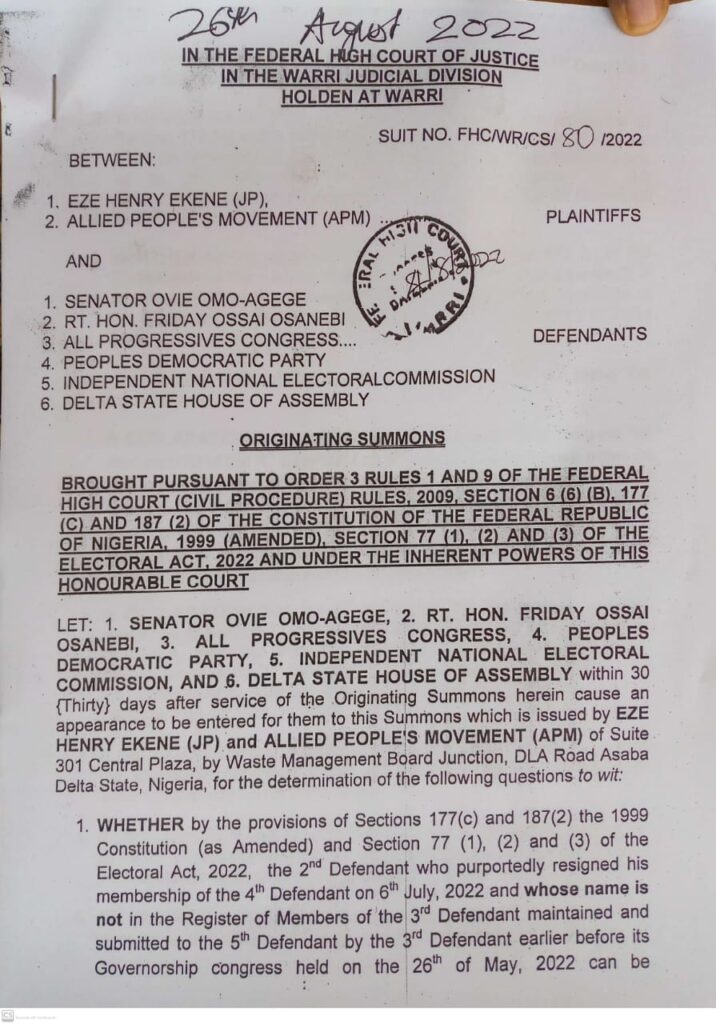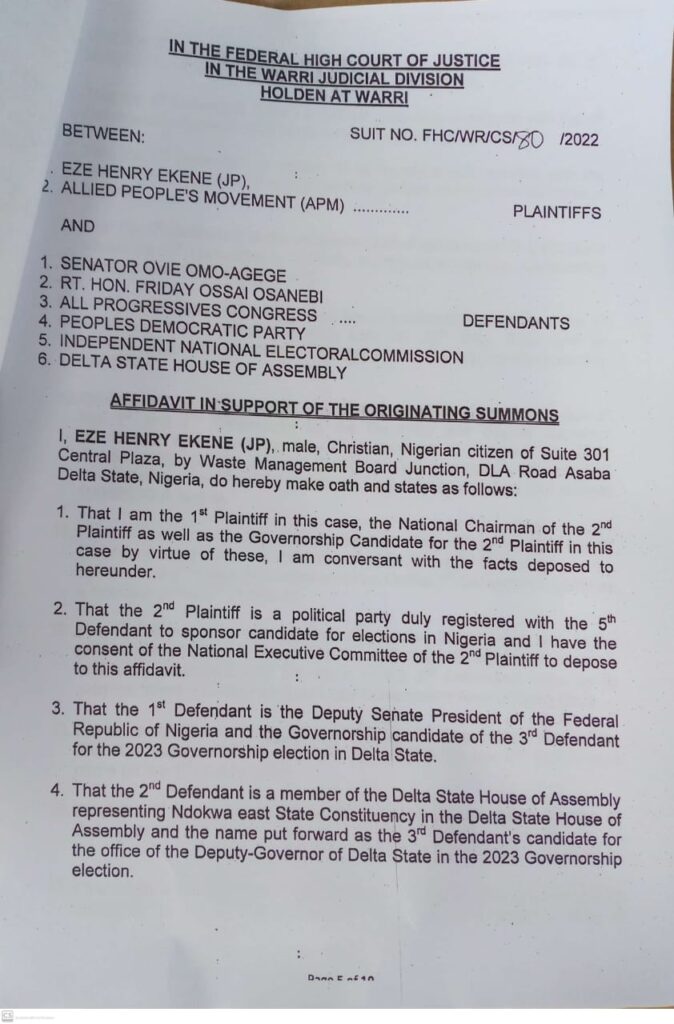 The Governorship Candidate of Allied People’s Movement (APM), Prince Henry Eze (JP) plaintiff has sued the Governorship Candidate of All Progressive Congress (APC) in Delta State, Sen. Ovie Omo-Agege, Delta All Progressive Congress (APC), Delta Peoples Democratic Party, The Leadership of Delta State House of Assembly, Independent National Electoral Commission in Delta State over alleged unlawful nornination of Rt. Friday OSANEBI as the Deputy Governorship Candidate of All Progressive Congress (APC) as Defendant.