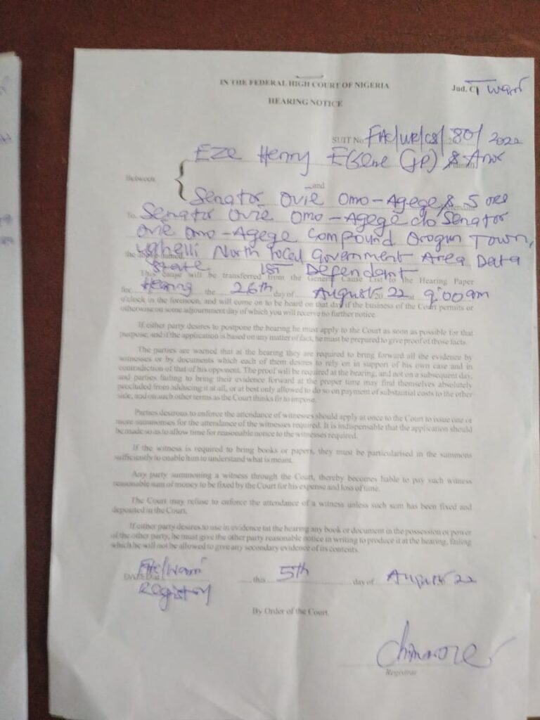 The originating summons in SUIT NO: FHC/WR/CS/80/22 for the hearing in the Federal High Court on the matter is scheduled to take place on 26th August, 2022