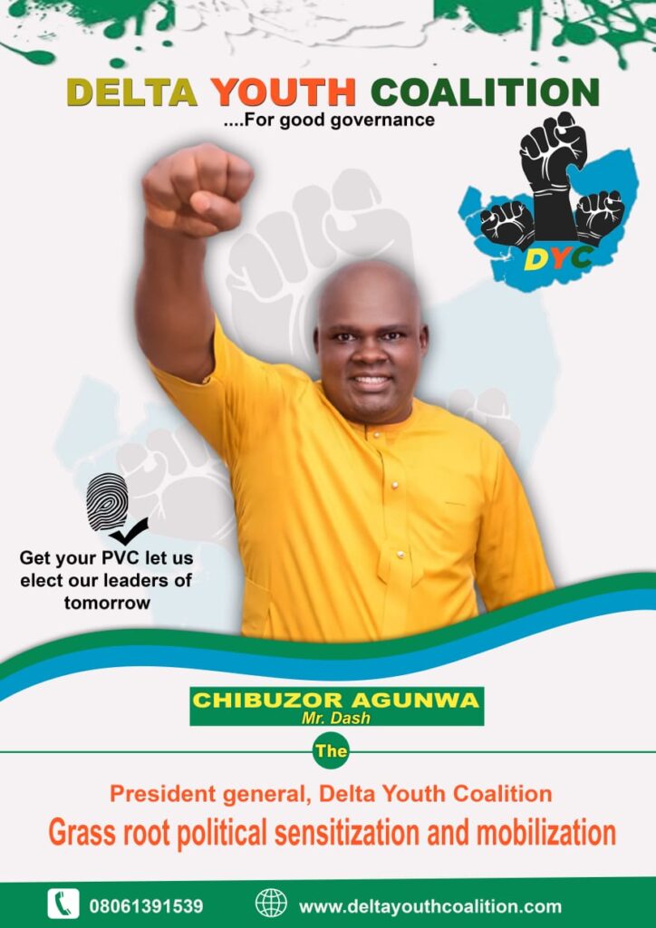 In the words of Mr Chibuzor Agunwa, the President-General, Delta Youth Coalition: ” We are NGO sensitizing the indigineous and non-indigenes of Delta State and Nigerians in general. We want Deltans, Nigerians to join hands with us, Delta Youth Coalition, DYC to sensitize and mobilize the Youths and Women towards ensuring that democracy prevails in the country. Also, to ensure that they are fully awakened to their civic right and constitutional responsibility to choose the leaders of their choice; use their votes to vote out corrupt politicians and install credible leaders in Delta State, and Nigeria in general”.