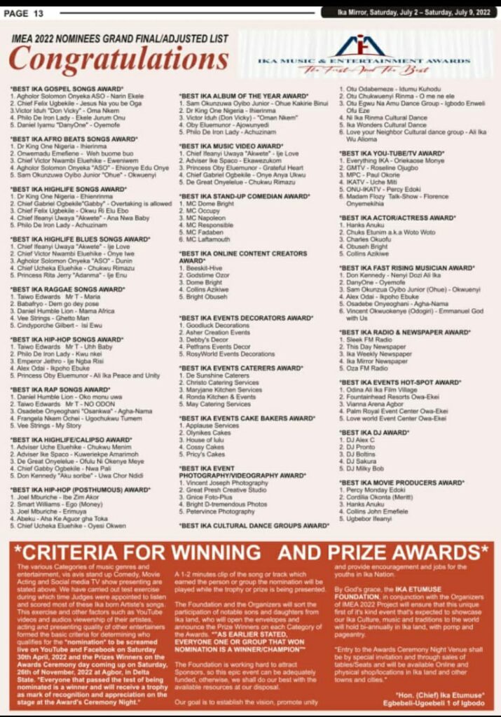 “We as organizers have equally released names of Distinguished Sons And Daughters of IKA Origin to be presented with Various Awards for their Contributions to the growth of Music And Entertainment Industry in Ika Nation”.