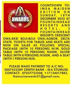 The statement by Chief Ika Etumese reads in parts:”Apart from the Socio-Cultural, economic importance of this event, we have released date, venue of event, Ticket Settings, Criteria for Winning Prizes/Awards of this unprecedented and Mother of All Music And Entertainment Show in Ika Nation on 18th December, 2022 at 2pm red carpet and 4pm Show”.