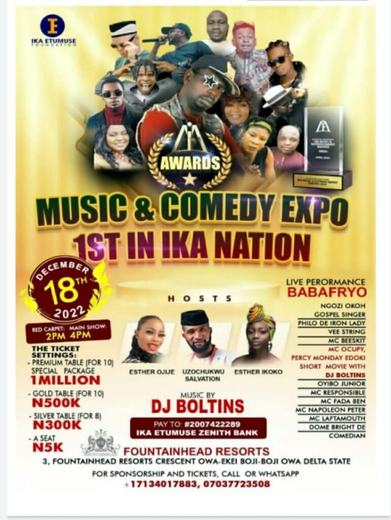 Ika Etumuse Foundation, in Conjunction with Ika People Worldwide Association (IPWA) and other development partners are set to host Maiden edition of Ika Music And Entertainment Awards (IMEA), an exposition of Awards, Music And Comedy featuring “the Denge Pose Master Babafryo, Philo De Iron Lady, Gospel Singer, Ngozi Okoh, Ohue Oyibo Junior, Vee Strings and a host other Ika born Comedians.