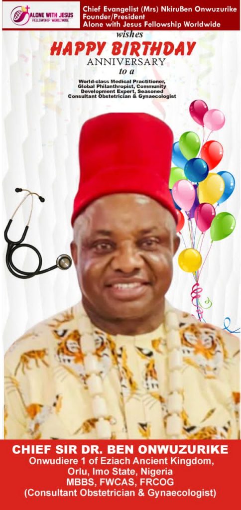 Globally acclaimed Minister of God’s word, Founder/President, Alone With Jesus Fellowship Worldwide, Evangelist NkiruBen onwuzurike today rejoices as she sends special greetings to her husband, Chief Dr. Ben Onwuzurike (JP), Onwudiere 1 of Eziach Ancient Kingdom, Orlu, Imo State, Nigeria as globally acclaimed Medical Doctor, Consultant Obstetrician & Gynaecologist marks his Birthday Anniversary Celebration in England.