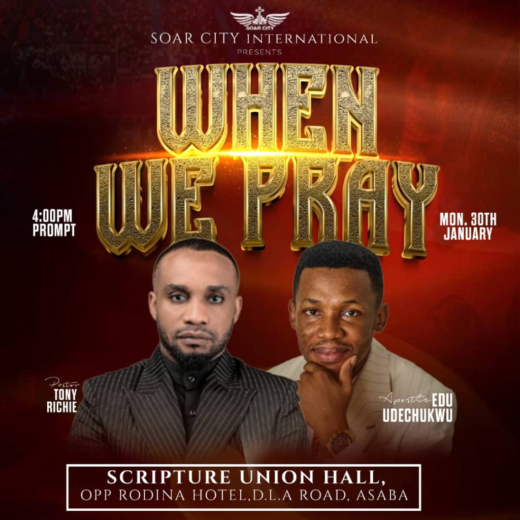 Soar City International, Asaba has said that its Fellowship is organizing a powerful prayer program tagged” “WHEN WE PRAY” featuring Apostle Edu Udechukwu as Guest Minister on Monday 30th January 2023 to start off spiritual activities for the year 2023.