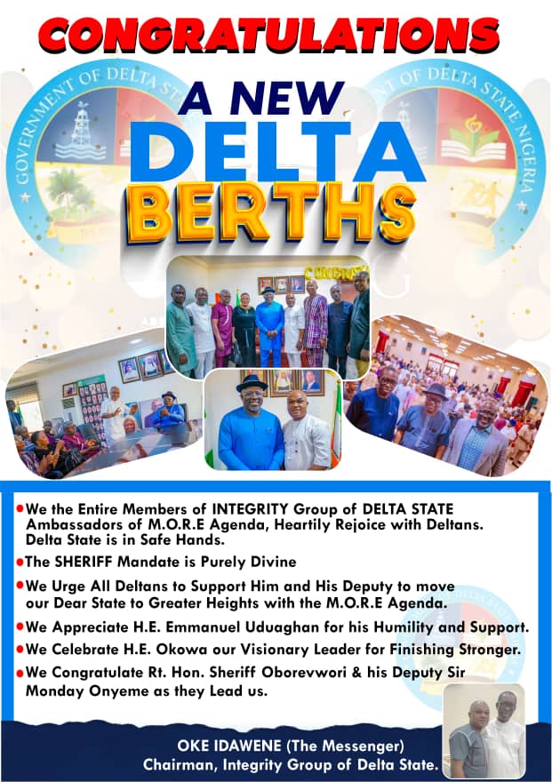 In the words of the Chairman of Integrity Group of Delta State (IGD), Hon. Oke Idawene: “IGD as a formidable Socio-political pressure group is committed to this new administration led by Governor Sheriff Oborevwori as part of its dedication, despite being condemned by supporting the new PDP Government led by Governor Sheriff Oborevwori and Deputy, Sir Monday Onyeme”.