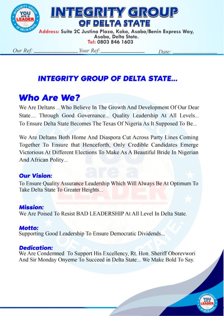 Integrity Group of Delta State is a formidable socio-political pressure group established some years ago by political actors of like minds of different professional backgrounds with structures in the entire three Senatorial Districts, 25 LGAs of Delta State, entire polling units in Delta State with major core values such as integrity, undivided loyalty, consistency, steadfastness, fairness, Justice, peace, unity, prosperity, good governance, growth and development.