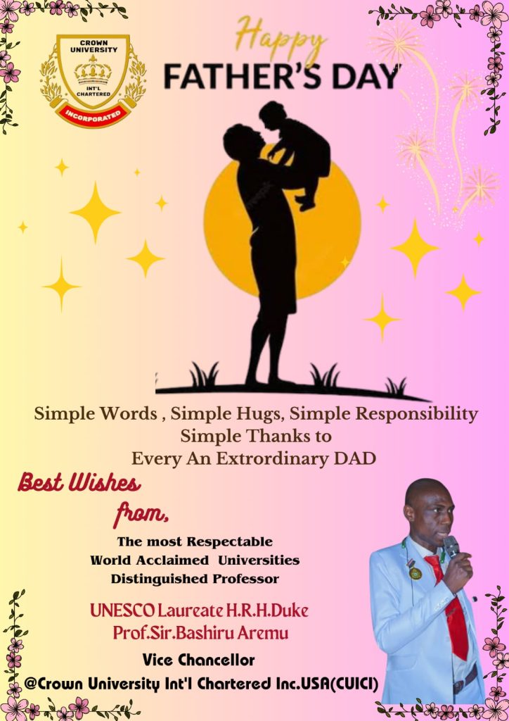 Crown University Int’l Chartered Inc,West Coast Int’l University of Science, Technology, Management and Arts formerly known as West Coast University United States of America,, Chartered Int’l Da Vinci University, University of Nations for Quality Education, International Chartered World Learned Society, Chartered World Order of Knights of Justice of Peace and others world wide and All my fans, supporters in world at large I Congratulate you all and wish you all Happy Fathers’ Day Celebration! UNESCO Laureate Prof Sir Bashiru Aremu.