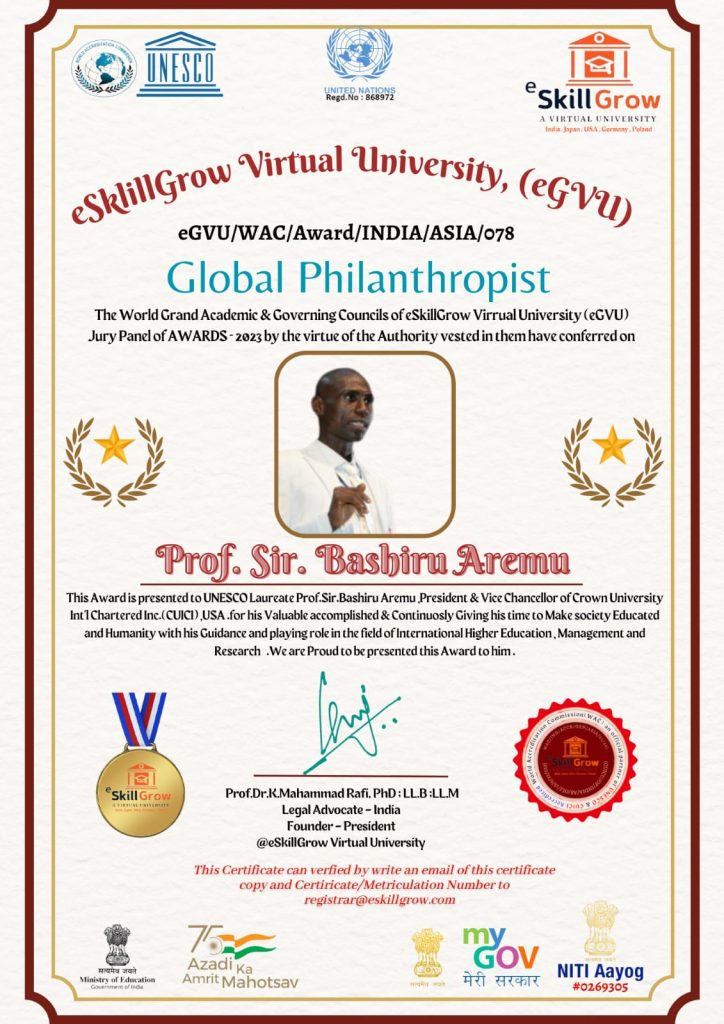 Prof Sir Bashiru Aremu, H.R.H Duke of Kingdom of Atlantis in Singapore & UNESCO Laureate and Vice- Chancellor, Crown University Int’l Chartered Inc., USA, has bagged Global PHILANTHROPIST Award-2023 from Asian, Indian Varsity, eSkillGrow Virtual University, India, Japan, USA, Germany & Poland as group celebrates him, hailed his accomplishments, contributions to the growth and development of International Education.