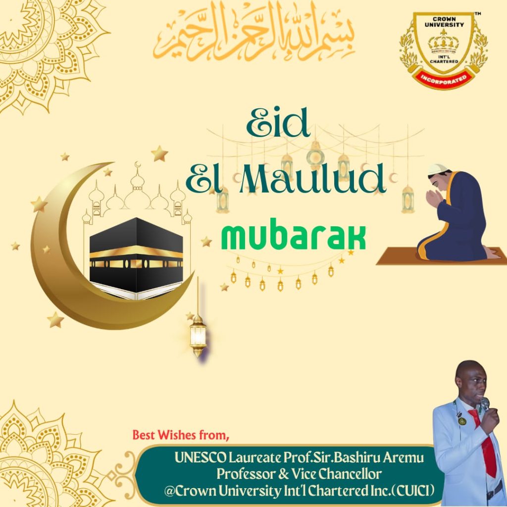 Prof Sir Bashiru Aremu, UNESCO Laureate and Vice-Chancellor Crown University International Chartered Inc., USA with its teaching hospital campus located at Santa Cruz Province, Argentina, South America and other partner constituents campuses at government regulated Universities Worldwide and online operation, has tasked Muslims all over the World on fear of God and love for one another, and patriotism as Islams today commemorates Birth of Islamic Prophet Mohammad in grand-style.