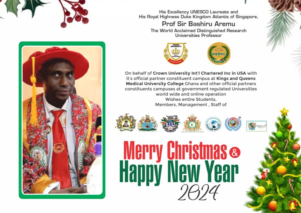 Prof Sir Bashiru Aremu, UNESCO laureate & Vice-Chancellor, Crown University International Chartered Inc in USA with Its teaching and research hospital Campuses located at Santa Cruz province in Argentina, Brazil and Spain with official partners constituents Campuses at government regulated Universities world wide and online operation, has send special greetings to Christians all over the world as he urges for unity, love and kindness amongst Nigerians, Africans and the rest of the world.