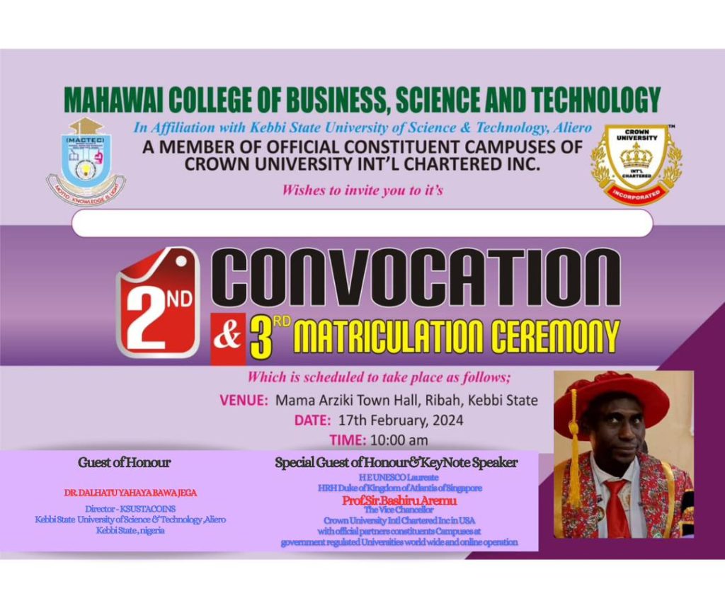 The Chairman, Board of Governing Council, Mahawai College Business, Science & Technology (MACTEC), Ribah, Kebbi State, Nigeria, Prof Sir Bashiru Aremu, has said that, he is using this medium to specially invite the general public as MACTEC higher institution is set for 2nd & 3rd Convocation/Matriculation Ceremony in Kebbi State, Nigeria.