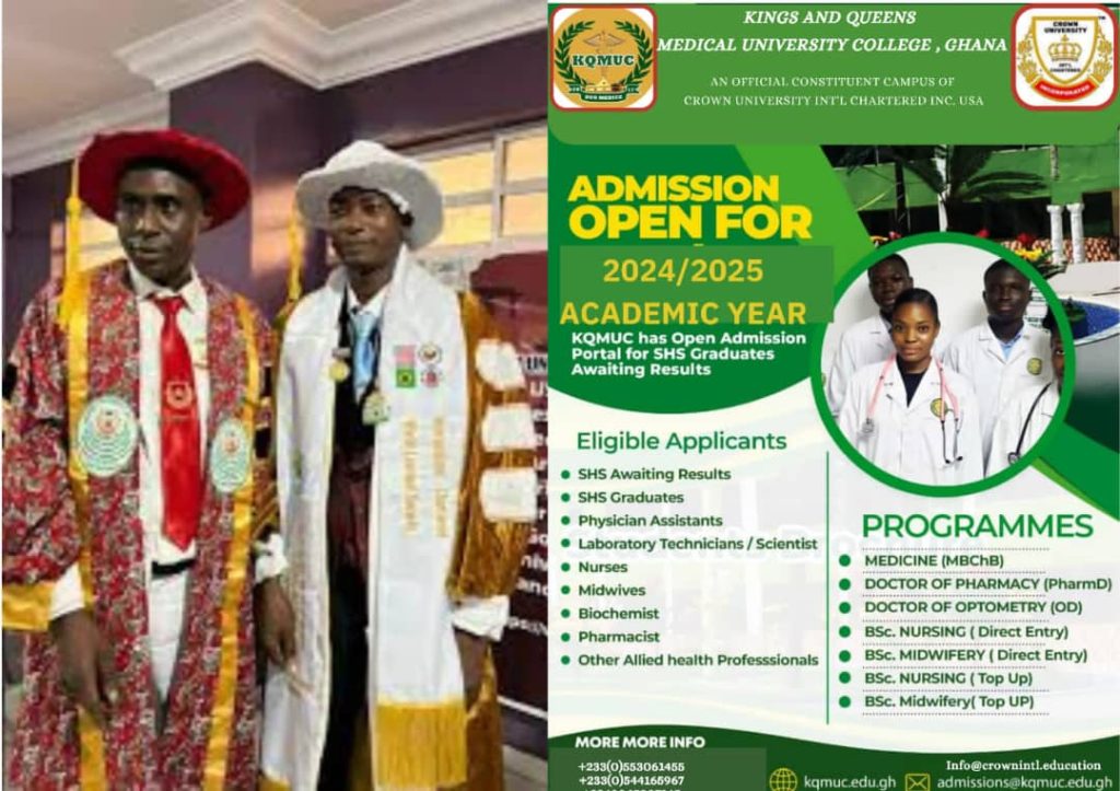 You could recall that KQMUC, Ghana, an official constituent campus of Crown University Int’l Chartered Inc., USA has urged prospective students to apply as Admission open for 2024/2025 Academic Year. Eligible Applicants are: SHS Awaiting Results, SHS Graduates, Physicians Assistants, Laboratory Technicians/Scientists, Nurses, Midwifes, Biochemist, Pharmacist, other allied health professionals.