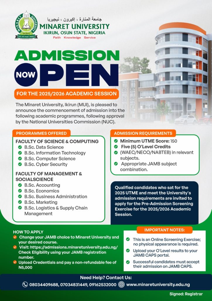 Minaret University, Ikirun, is pleased to announce the commencement of admissions for the 2025/2026 Academic Session.