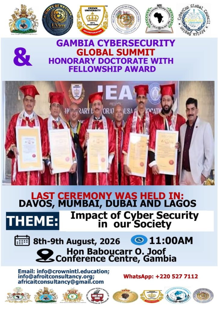 Prof Sir Bashiru Aremu, The First African UNESCO Laureate and World Records Holder, has said that Crown University International, USA In collaboration with The Government of The Republic of Gambia- Gambia Telecommunications Company Ltd Mandela and other development partners will host first ever Gambia Cyber Security Global Summit and Award Ceremony scheduled to take place on August 8th- 9th , 2026, at Hon. Baboucarr O Joof Conference Center, Gambia.