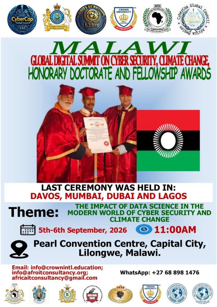 He said: “The event will be anchored in partnership with other development partners. That this is will be first ever Malawi Digital Global Summit On Data Science in The Modern World of CyberSecurity & Climate Change, followed by an award of Honorary Doctorate Degree Ceremony to be anchored by Crown University International Chartered, USA”.This international event is scheduled to take place on September 5.6, 2026 at Pearl Convention Center, Lilongwe in Malawii”.